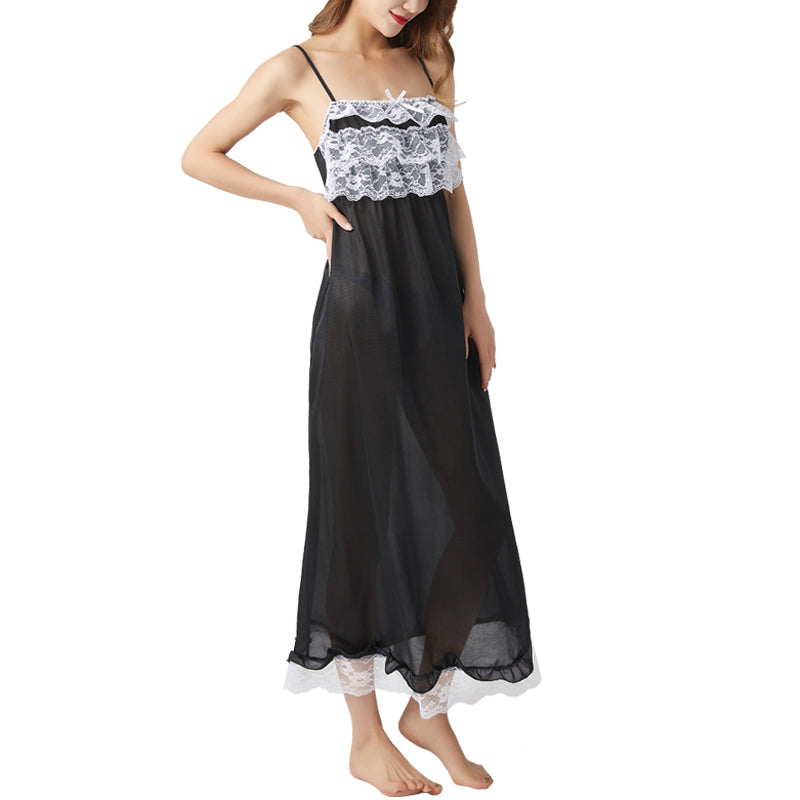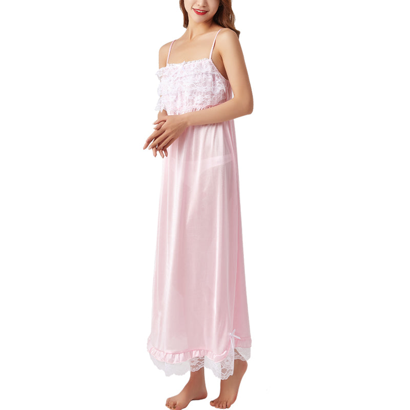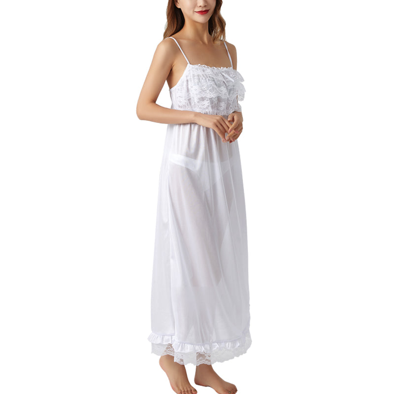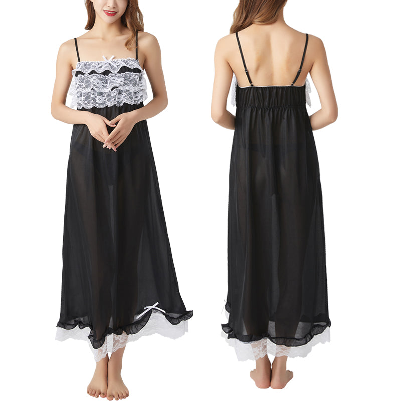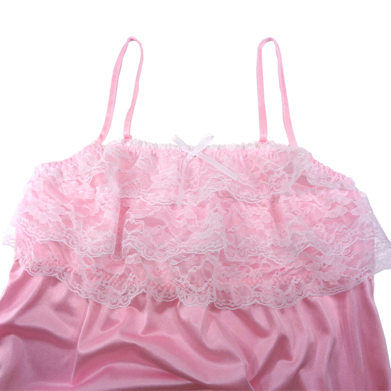 ■胸元に3段レース、裾に共布フリルとレース、片側裾にリボン付きを配しフェミニンな印象に